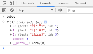 - 아래 사진을 보면 toDos에는 입력된 데이터가 Object형태로 잘 저장된 것을 확인할 수 있다.