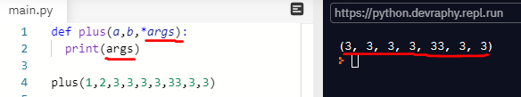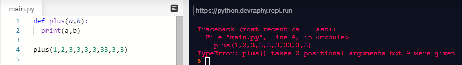 - 예를 들어 위와 같은 함수가 존재할 때, plus함수를 사용하기 위해서는 a,b에 해당하는 매개변수(positional argument)를 반드시 입력해야한다. 반대로 a,b이상의 즉, 두개 이상의 매개변수를 넣는다면 아래의 사진과 같이 에러가 발생하게 된다.