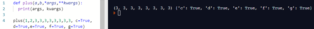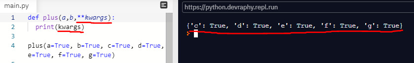 - 그럼 a=1과 같은 변수형태의 keyword argument는 사용할 수 없는가? *args 대신 **kwargs를 사용하면 된다.