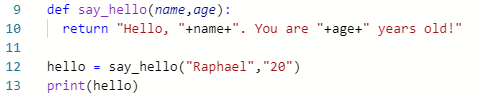 위와 같은 함수가 존재할때, name과 age라는 매개변수(argument)의 값과 상관없이 say_hello함수를 호출하면 return문에 포함된 문자열(String)이 그대로 출력된다. return문의 문자열에 포함된 name과 age 부분이 매개변수의 값에 따라 자유롭게 변경될 수 있게 하기 위해 우리는 Keyword Arguement를 응용하여 사용할 수 있다.