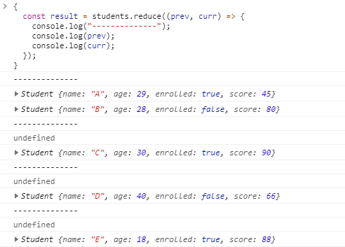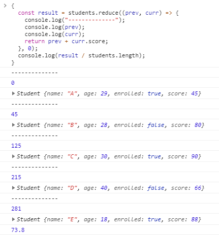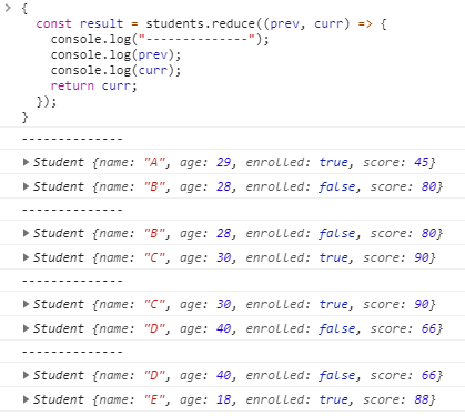 - 위에서 말했듯이, reduce는 배열의 각 요소를 prev와 curr를 이용하여 받아온다.