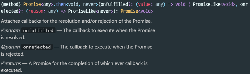 - 위의 문서에 적힌 설명을 읽어보면 onfulfilled(성공)인 경우 value를 paramter로 사용하고, onrejected(실패)인 경우 reason을 사용한다고 나와 있다. 맨 마지막에 @returns 부분을 읽어보면 실행된 callback이 완료될 경우, 그 결과값을 갖고 있는 promise를 반환한다는 것을 알 수 있다.
