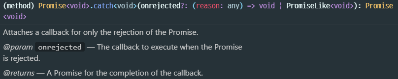 - @param onrejected 부분의 설명을 읽어보면, catch는 promise가 실패한 경우 실행되는 callback이라고 명시되어 있다.