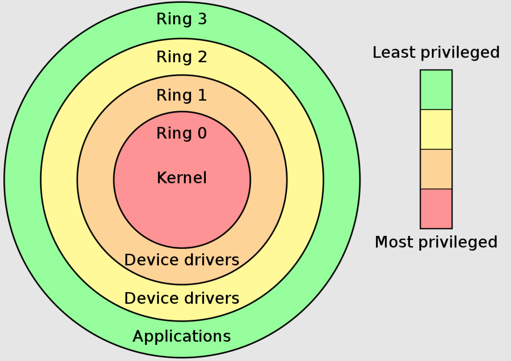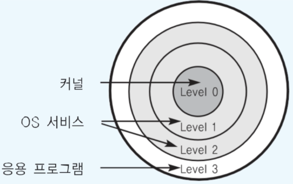 - 대부분의 운영체제는 Ring 0(커널모드)과 Ring 3(사용자모드)만 사용한다.