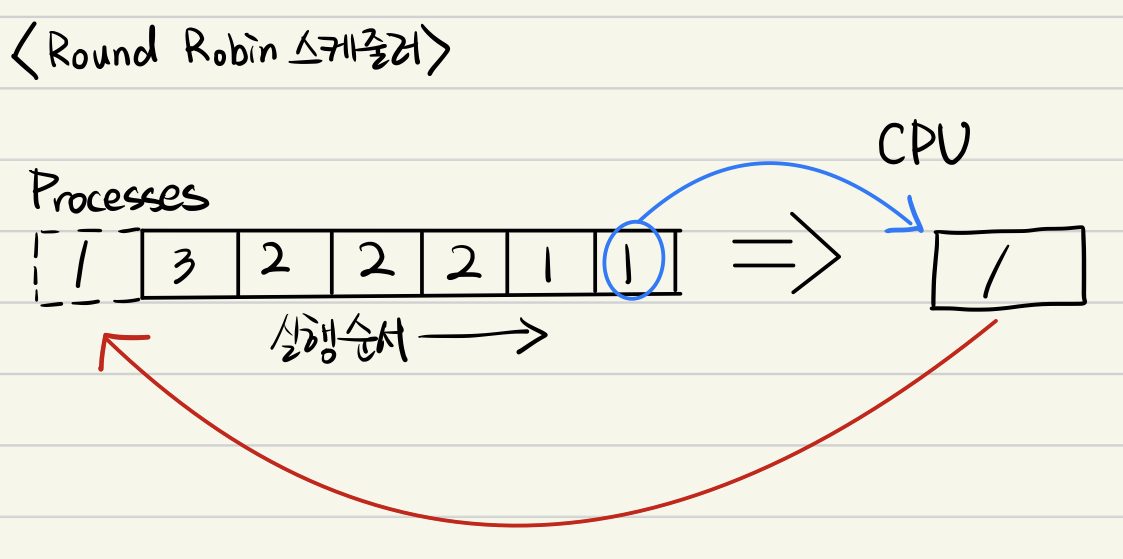 - 프로세스가 CPU에 로드되는 것이 순서에 따라 순환하는 방식으로 동작한다.