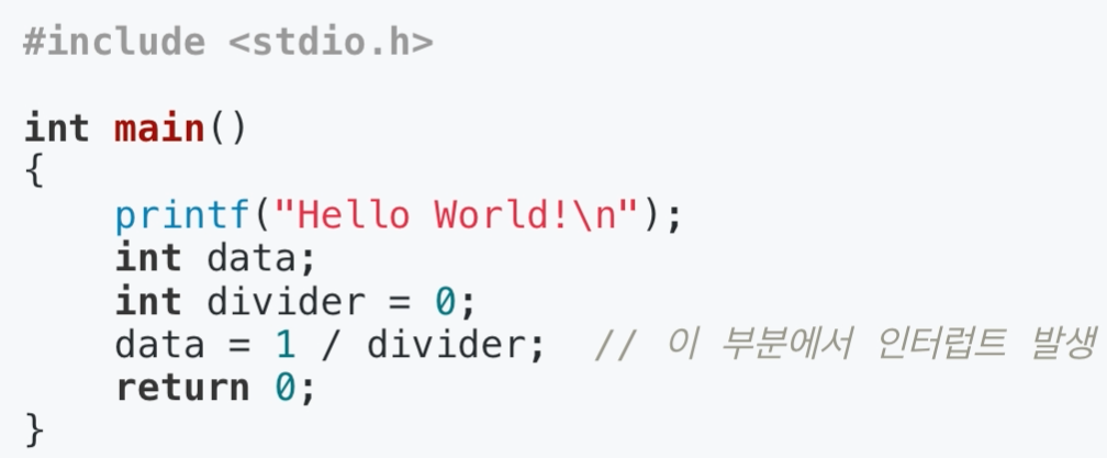 - 위의 코드를 보면 인터럽트가 발생하는 부분은 1을 0으로 나누는 부분이다.