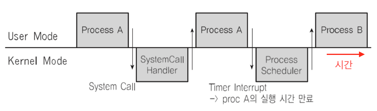- 인터럽트 처리를 위해, 커널모드로 변경된 후 시스템 콜을 실행한다.