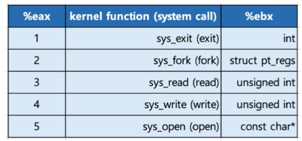 - ebx 레지스터에 시스템 콜에 해당하는 인자값(=매개변수)를 넣는다.