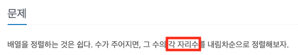 - sort를 사용하여 풀면 간단하게 해결되지만, 자리수를 이용하여 풀는 방법을 알아보자.
