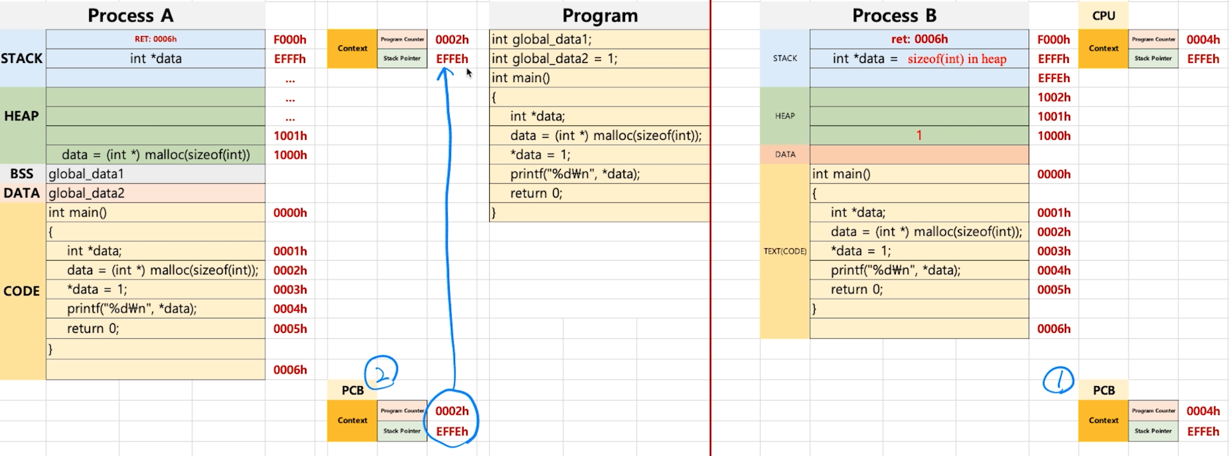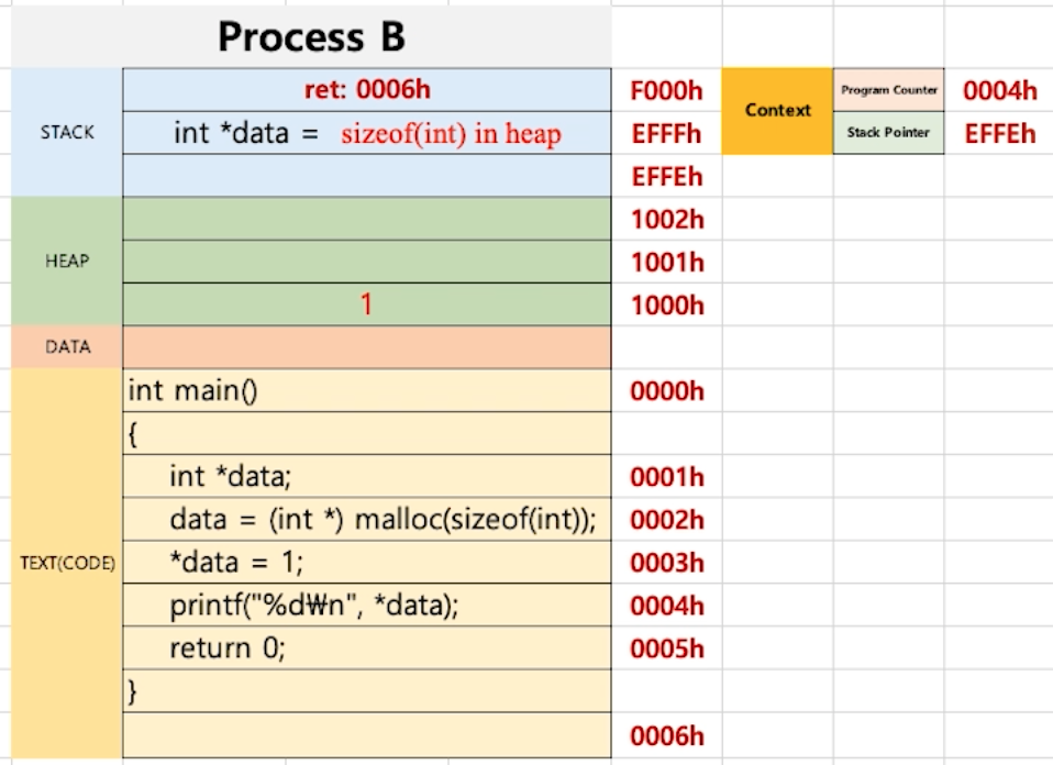 - 리턴 주소값이 0004h 인 코드까지 프로세스 B를 실행한 상태에서 다시 프로세스 A로 스위칭한다고 해보자.