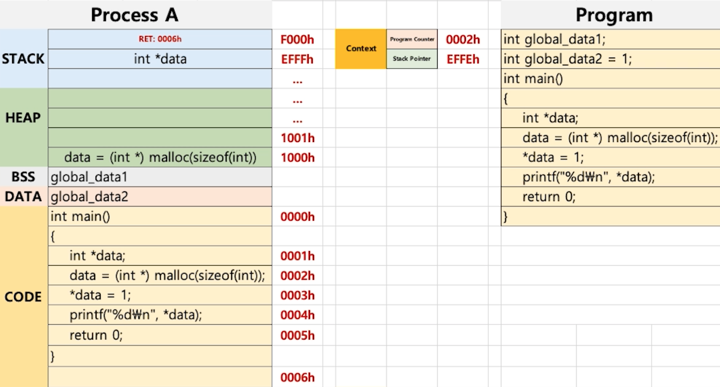 - 하지만, PC와 SP는 CPU의 레지스터로써 모든 프로세스가 공유하여 사용하는 메모리다. 다시말해, 하나밖에 없다는 것을 인지하자.