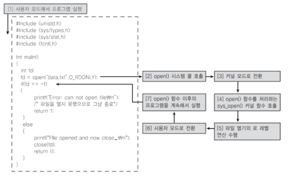 - 먼저, open() 이라는 시스템 콜을 이용하여 파일을 가져온다.