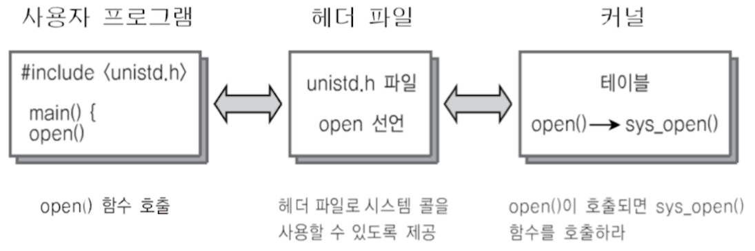 - 시스템 콜은 소스코드에 등록해놓은 헤더파일에 들어있는데, 이를 사용하는 과정은 다음과 같다.