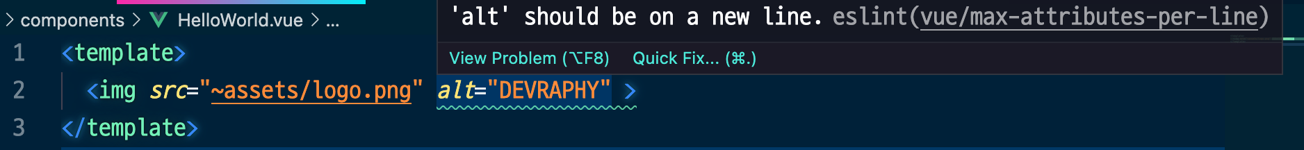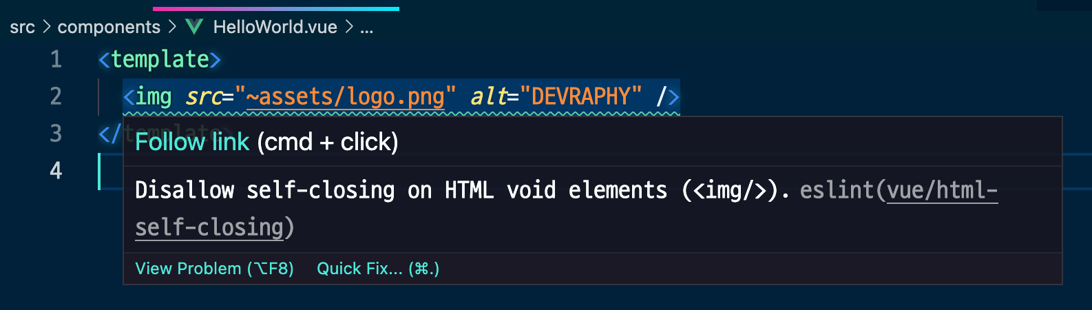 - ESLint가 잘 설치되었다면 HelloWorld.vue 파일에 다음과 같은 에러메세지를 확인할 수 있다.