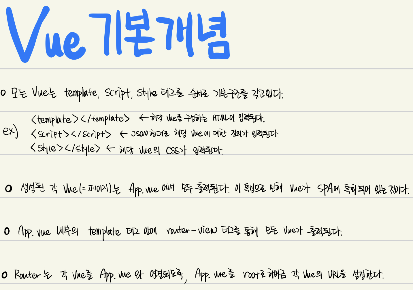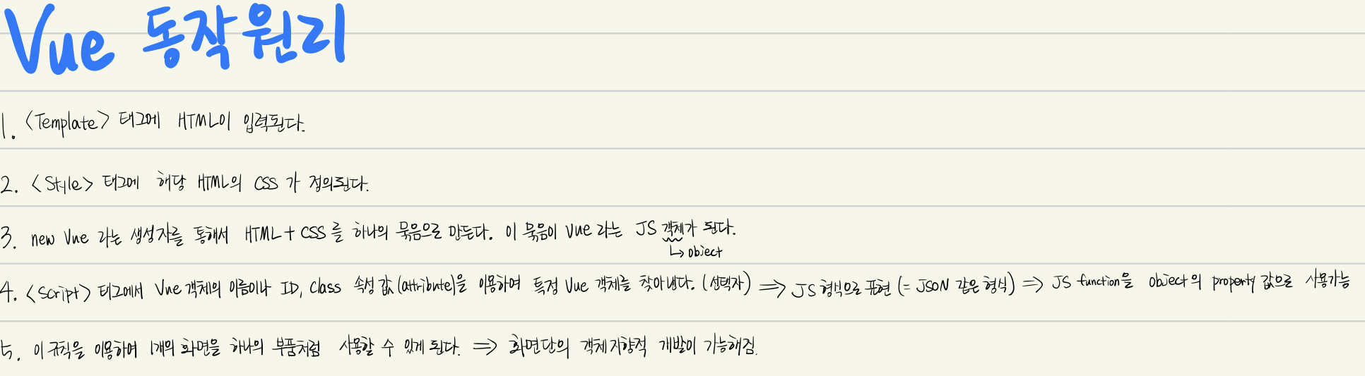 - vue가 이 컴포넌트의 역할을 하기 때문에 vue는 하나의 화면을 의미한다.