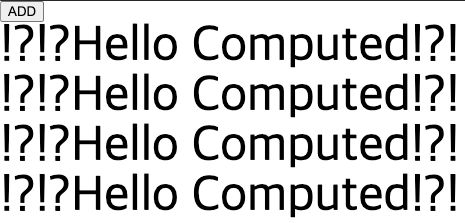 - 버튼을 누르면 add 메소드가 동작하여 computedMessage의 내용에 문자열 '!?'을 추가하여 출력하도록 한다.
