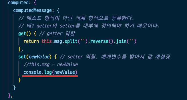 - 여기서 computed 속성이 왜 Getter인지를 알 수 있는데, 그 이유는 값을 읽어올 수는 있어도 변경할 수는 없기 때문이다.