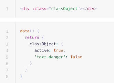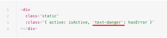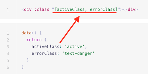 - 클래스 바인딩을 사용할 때에는 콜론(:)으로 v-bind 옵션을 class에 붙여준다.