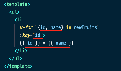 - v-for 디렉티브를 사용할 때에는 반드시 고유값을 key로 설정해야 하기 때문에 고유값인 fruit.id를 key로 설정하였다.
