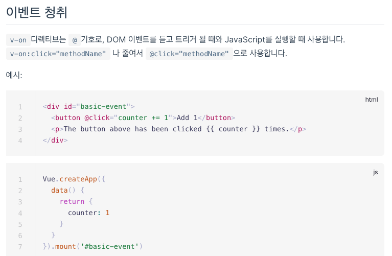 이벤트 핸들링 이벤트 청취 v-on디렉티브는 @기호로, DOM 이벤트를 듣고 트리거 될 때와 JavaScript를 실행할 때 사용합니다. v-on:click="methodName" 나 줄여서 @click="methodName"으로 사용합니다. 예시: Add 1 Th