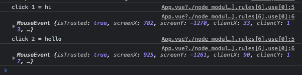 <button @click="handler('click 1 = hi', $event)">