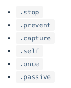 - 이벤트 수식어란 v-on 디렉티브에서 사용할 수 있는 다양한 수식어를 의미한다.