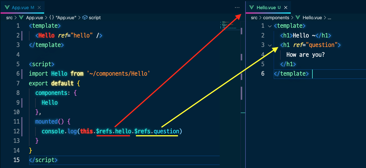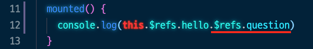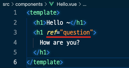 - hello.vue 컴포넌트 내부에 question이라는 ref가 존재하기 때문에, 위와 같은 구조의 참조가 작성되는 것이다.