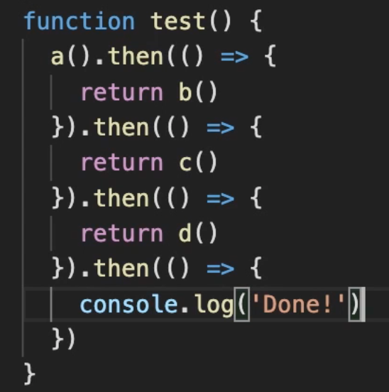 - promise를 사용했음에도 콜백의 구조에서 벗어날 수 없는 것이다. 그러므로 콜백의 단점을 그대로 가져가게 된다.