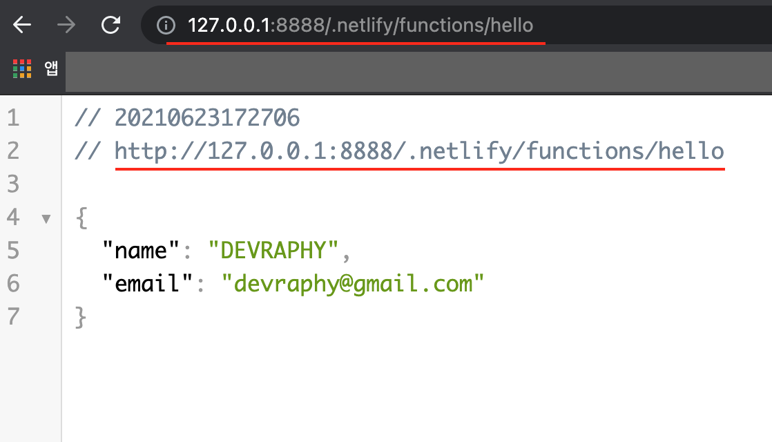 - 주소창 입력: 기본 주소 뒤에 #을 지우고 /.netlify/functions/hello 를 입력한 후 확인