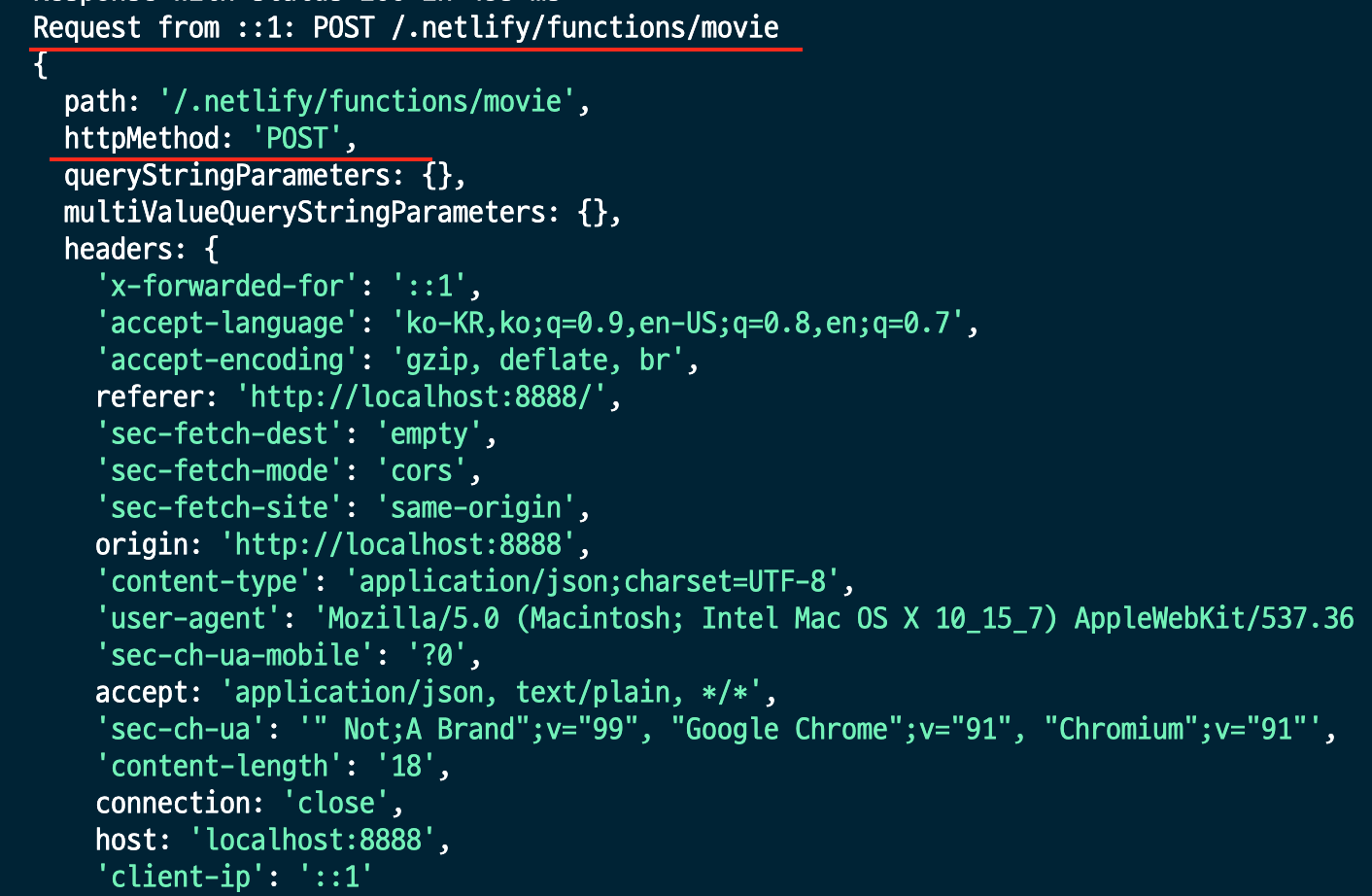 - post 방식으로 serverless 함수를 정의한 파일에서 요청이 잘 들어간 것을 확인할 수 있다.