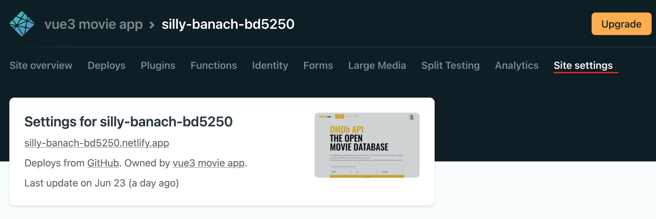 - Netlify에 접속하여 배포된 프로젝트를 클릭하면, 다음과 같이 site settings라는 메뉴를 확인할 수 있다.
