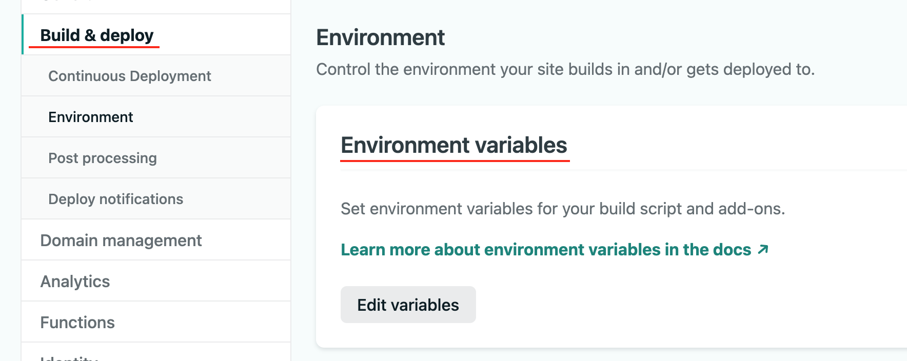 - 그리고 Build & deploy라는 메뉴를 선택하여 들어가보면 Environment variables라는 부분이 있다.