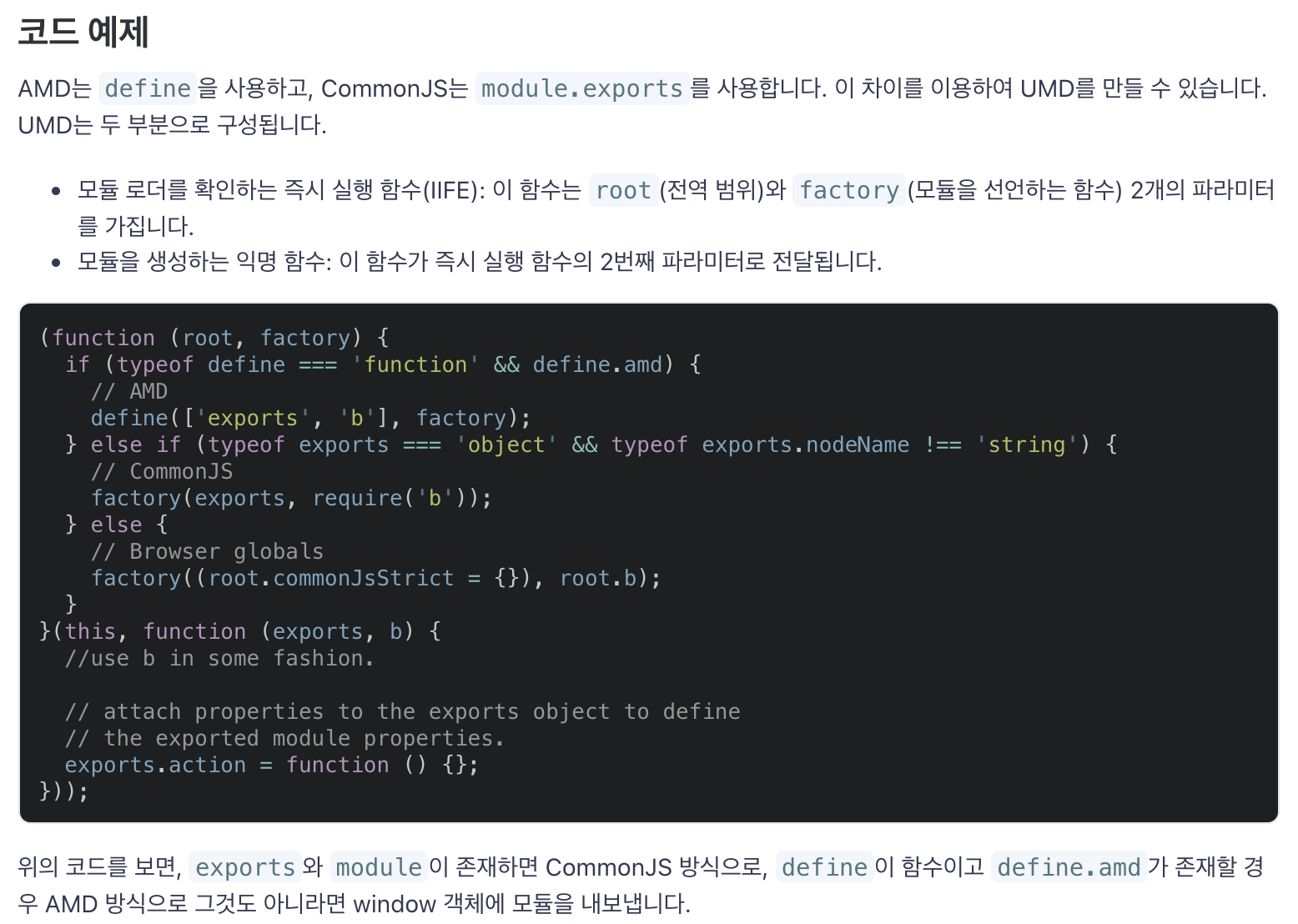 - 특정한 키워드나 규칙이 있다기 보다는 AMD와 CJS를 함께 사용하는 방식으로 디자인 패턴에 더 가까운 개념이다.