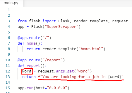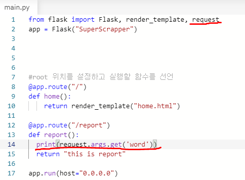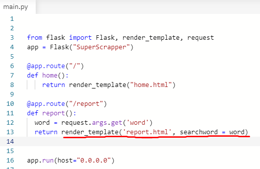 - /report 경로로 접근하면 report 함수가 실행됩니다. 그러면 report.html이 실행될 수 있도록 함수의 return문을 이용해 검색된 단어를 searchword라는 변수에 담아서 report.html로 전달 및 실행되도록 하는 것입니다.