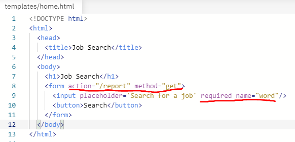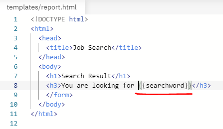 - return문에서 받아온 변수(searchword)를 report.html에서 사용하려면 이중괄호{{}} 안에 전달 받을 변수명을 넣습니다.