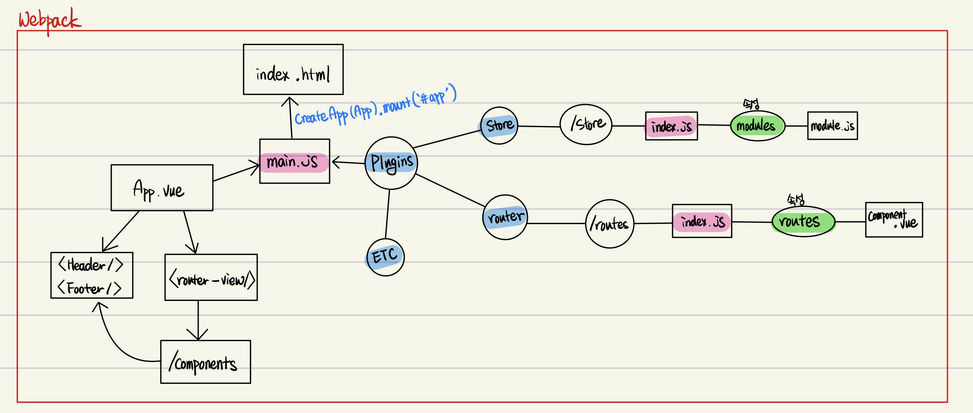 - 이로써 main.js를 중심으로 App.vue와 index.html이 연결된 것이다.