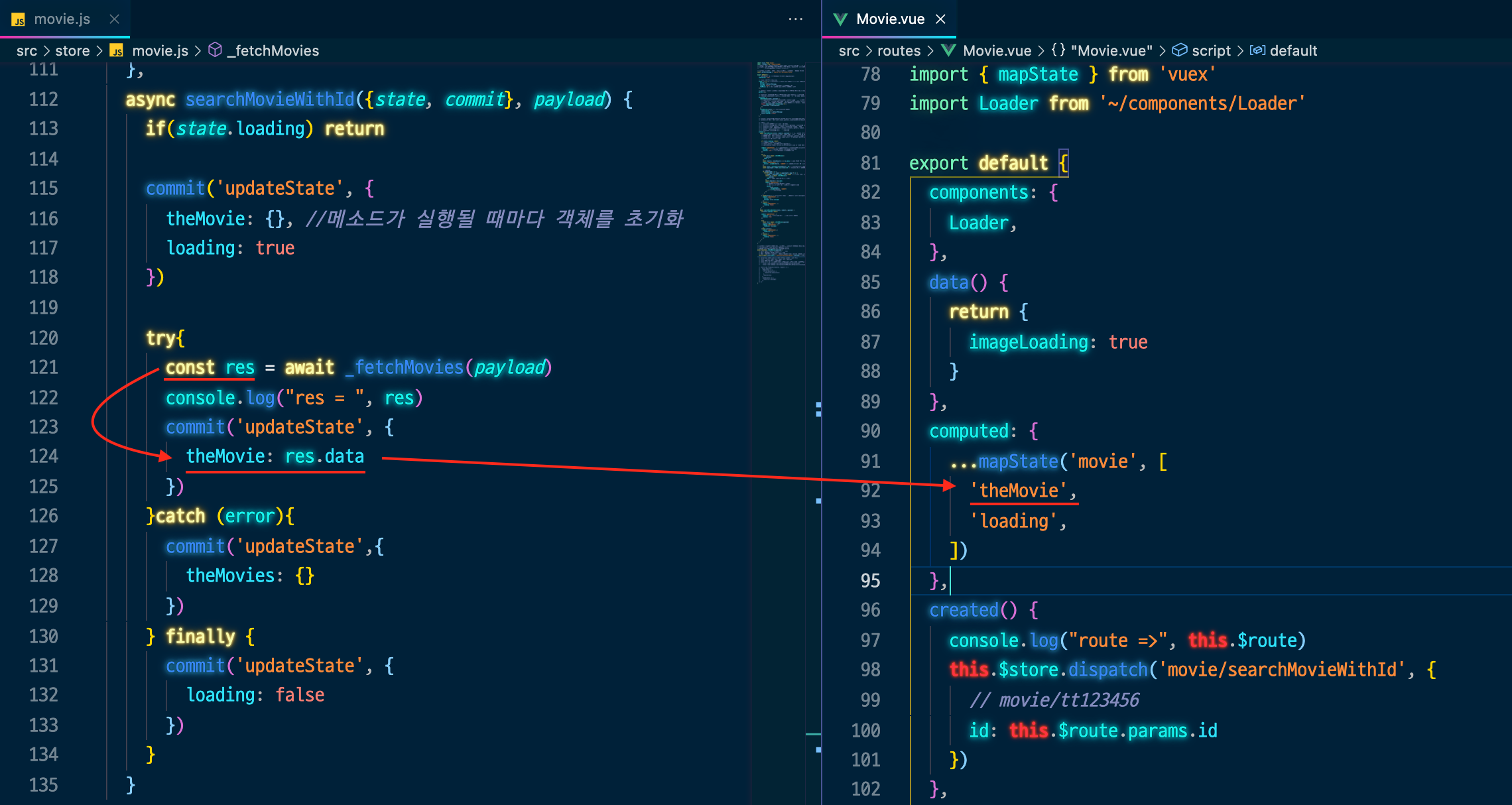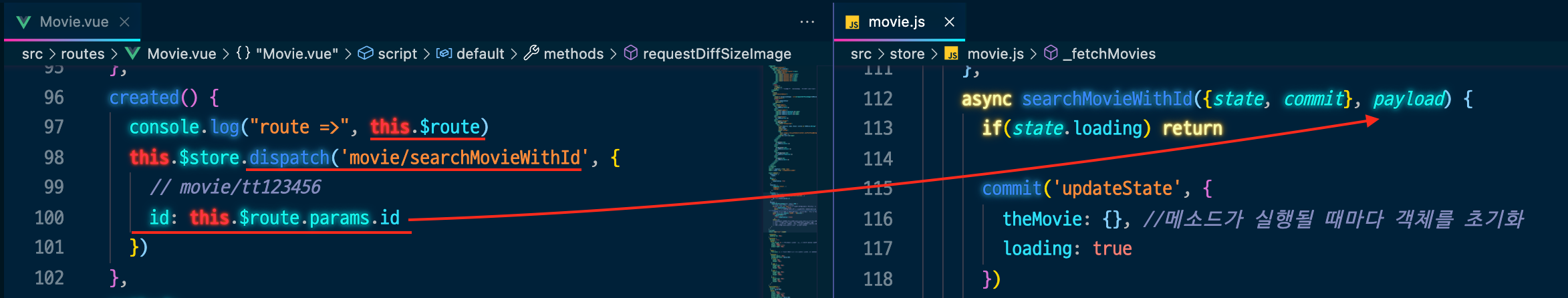 - Movie.vue에서 route객체를 통해 영화 ID를 전달 받고, 해당 ID값을 store의 'movie' 모듈에 있는 searchMovieWithId() 메소드에게 매개변수로 넘긴다.