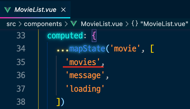 - computed: ...mapState()를 통해 store의 'movie' 모듈에 있는 state를 가져온다.