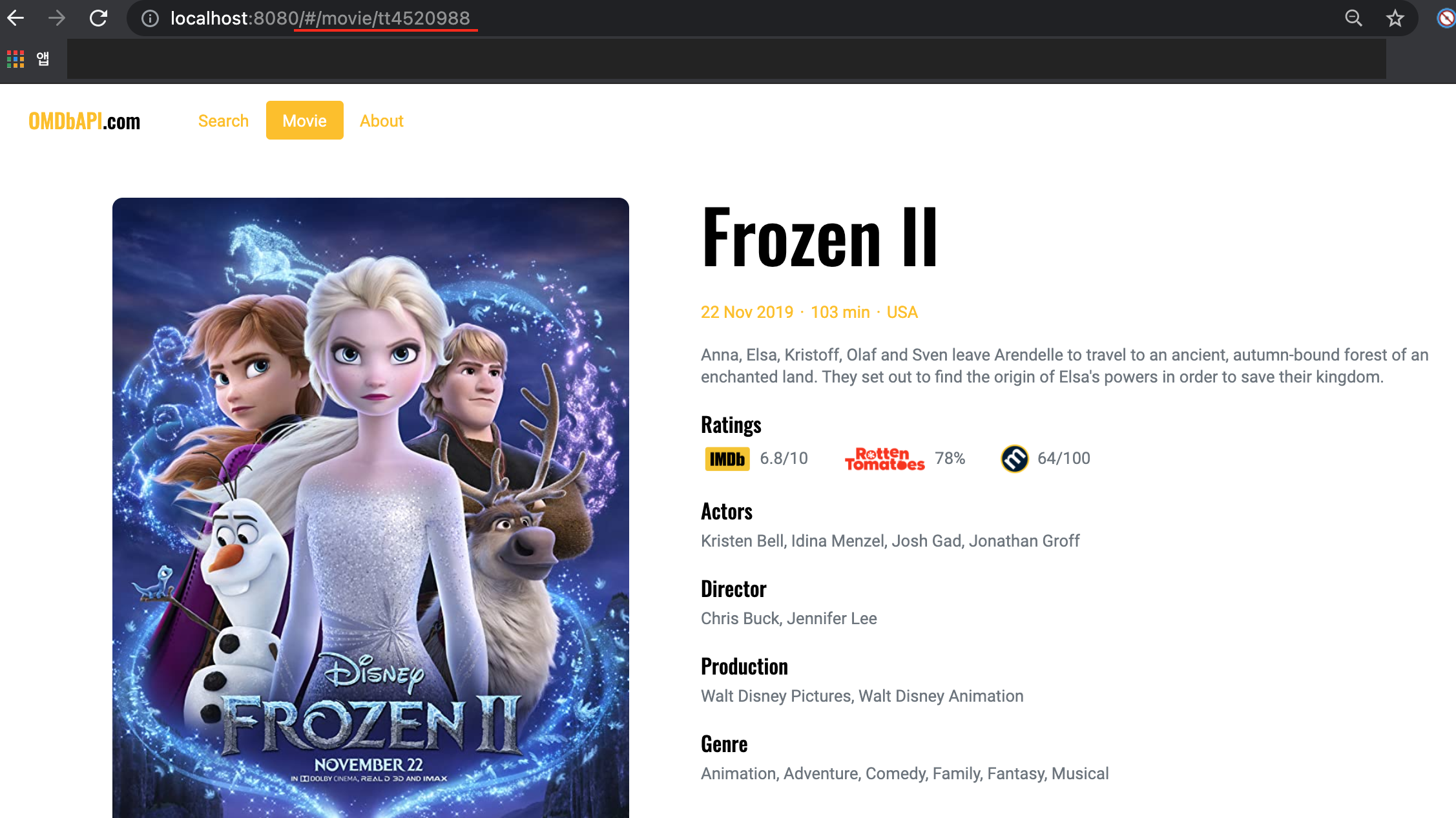- theMovies 객체의 정보를 기반으로 한개의 영화의 상세 정보 페이지가 출력된다.