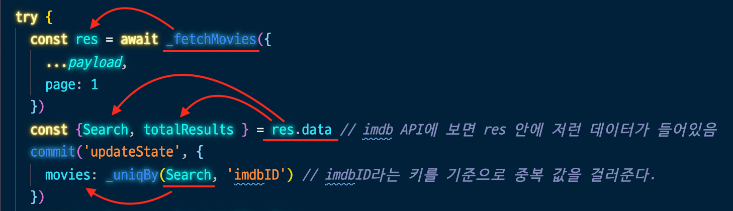 - res를 객체구조분해를 사용하여 필요한 데이터만 store의 'movie'모듈의 movies라는 state에 저장한다.