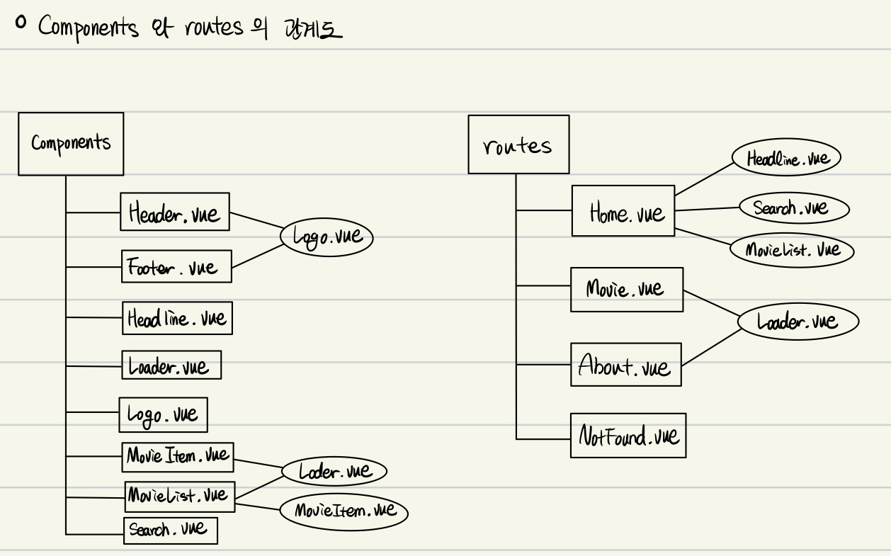 - 각 컴포넌트와 라우트가 어떻게 이어져 있나 그 관계도를 그림으로 그려보았다.