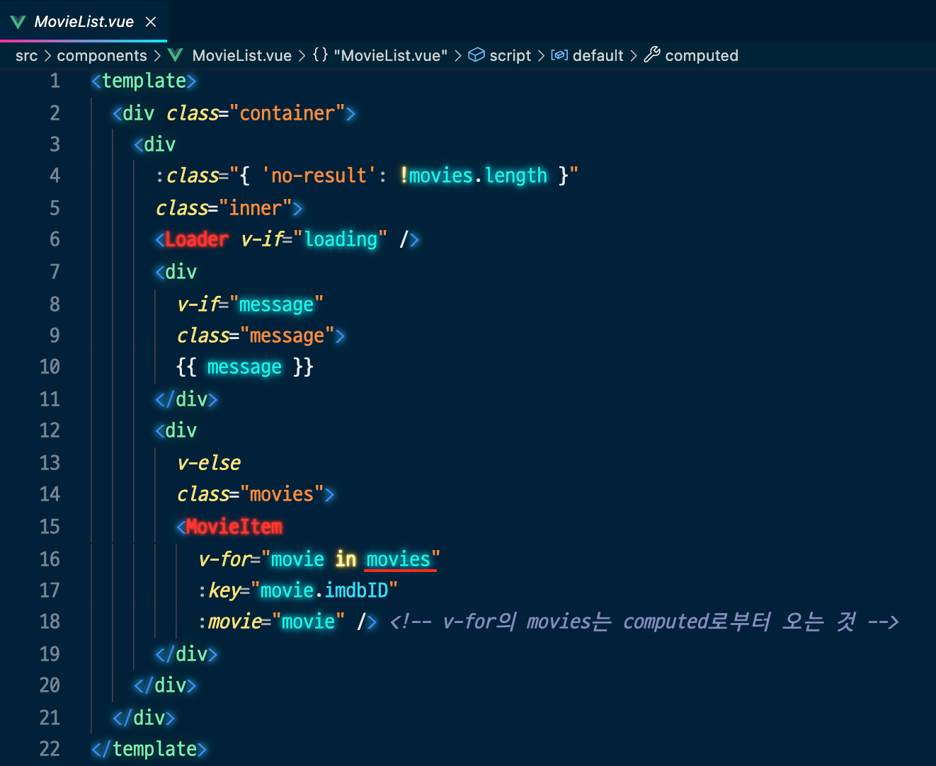 - Movie.vue에서 computed 속성을 통해 theMovies 객체정보를 읽어온다.