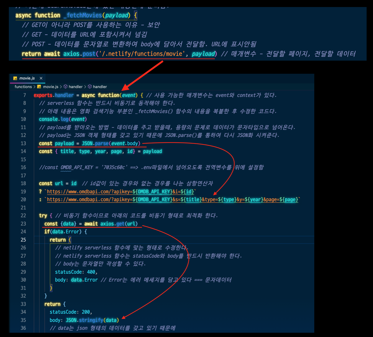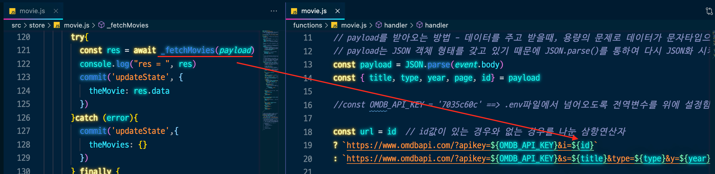 - _fetchMovies() 메소드에서 payload 내부의 데이터를 사용하여 OMDb_API에게 값을 넘긴다.
