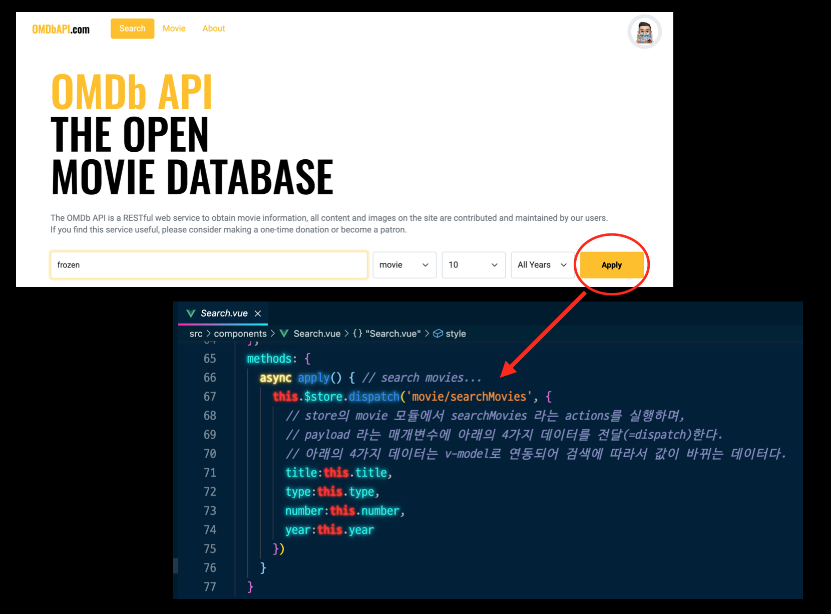 ▶ apply(): 입력된 검색정보를 dispatch()를 통해 store - movie.js - searchMovies() 메소드의 매개변수로 전달한다.
