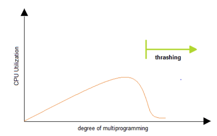 - 반복적으로 page fault(인터럽트)가 발생하여 과도하게 페이지 교체 작업만 일어나는 상황