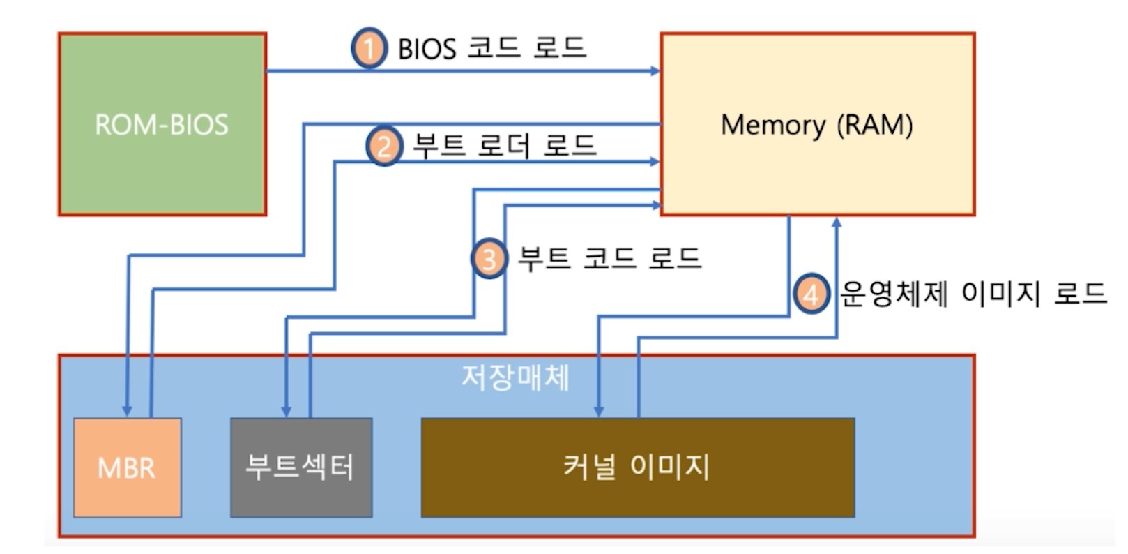- 컴퓨터를 키면, BIOS가 특정 Storage를 읽어와 bootstrap loader를 메모리에 올리고 실행한다.