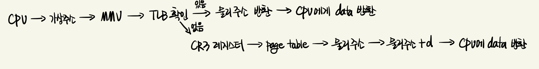 CPU - 가상주소 - MMU - CR3 레지스터 - 페이지 테이블 - 물리메모리 시작주소 + 변위 - 데이터 - CPU에게 반환