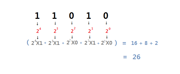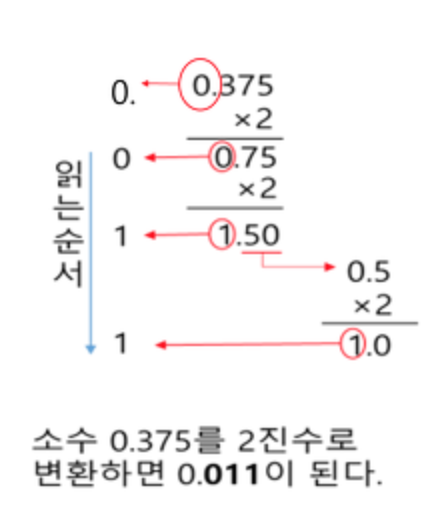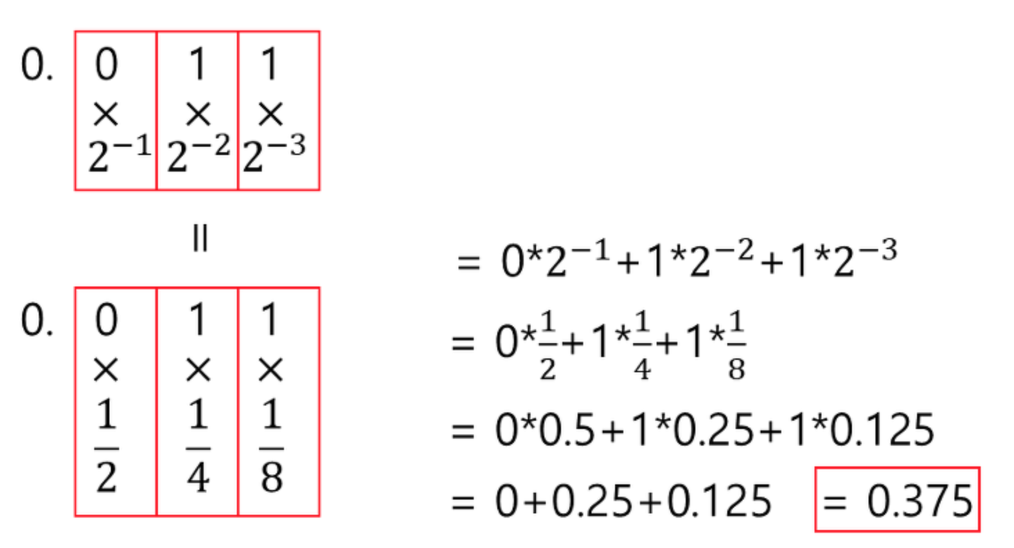 - 2진법 소수를 10진법으로 변환할 때, 소수점 이후의 정수부분은 위에서 설명한 2진법 변환 방법과 동일하게 계산한다.