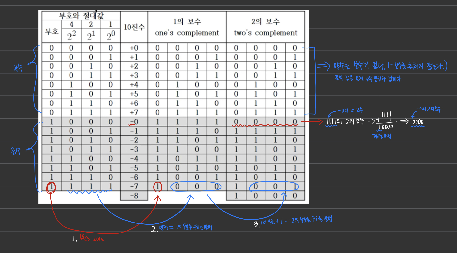 - 0부터 7까지는 1과 2의 보수가 이진법으로 표현된 수와 동일한 것을 알 수 있다.
