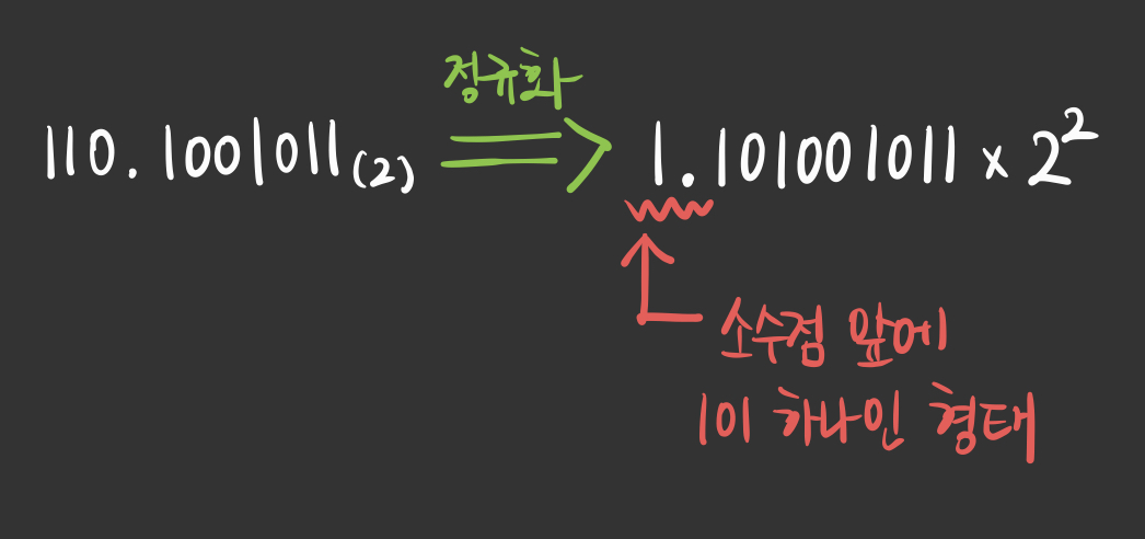 - 정규화란, 소수점 앞에 1이 하나인 형태로 소수점을 이동시켜 표현하는 것이다.